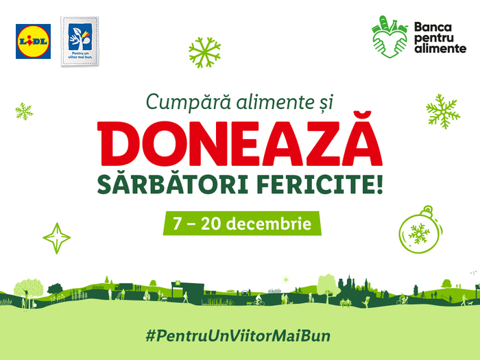 Și anul acesta, Lidl își implică activ clienții în sprijinirea persoanelor defavorizate, prin organizarea unei noi campanii de colectare de alimente între 7-20 decembrie, în parteneriat cu rețeaua Băncilor pentru Alimente din țară. După ediția pilot din decembrie 2019, acum, Lidl extinde lista de magazine participante la campanie la 80 de unități. În plus, și numărul beneficiarilor campaniei a crescut, anul acesta fiind implicate în această inițiativă atât Băncile pentru Alimente din București, Cluj-Napoca, Roman, Brașov și Oradea, cât și cele din Timișoara și Constanța, recent inaugurate cu sprijinul Lidl și al celorlalți parteneri. Până acum, Lidl a investit peste 2.400.000 lei în înființarea celor 7 Bănci regionale pentru Alimente.