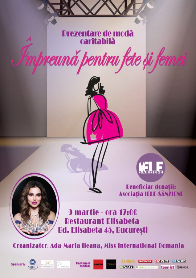 Evenimentul caritabil „Împreună pentru fete și femei” va avea loc pe 9 martie, la Restaurantul Elisabeta (Bd. Elisabeta 45), sub forma unei prezentări de modă, organizat de Miss International România, Ada-Maria Ileana. Scopul este strângerea donațiilor pentru organizația Iele-Sânziene, iar jumătate din donații vor fi direcționate pentru sprijinul refugiaților ucraineni, prin Crucea Roșie Română. Printre modele se vor număra și alte reprezentante ale României la concursuri internaționale de frumusețe, precum Miss Universe și Miss Supranational. 13 designeri români, talentați și apreciați în lumea modei, își vor prezenta ultimele colecții: de la ținute de zi, până la rochii și costume de gală. Câteva dintre piesele prezentate vor fi licitate și vor exista și alte oportunități de a dona. Donația minimă la intrare va fi de 50 RON.