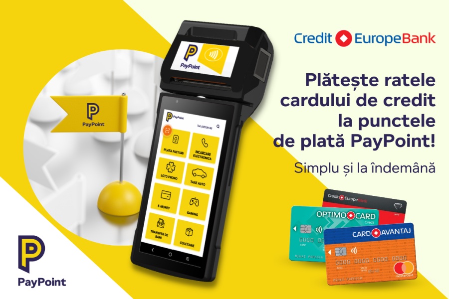 Toți clienții Credit Europe Bank posesori de carduri de credit beneficiază din luna mai de o nouă modalitate simplă și rapidă de plată a ratelor lunare, datorită parteneriatului încheiat de PayPoint România și Credit Europe Bank. Astfel, deținătorii cardurilor de credit emise de către bancă vor putea efectua plăți fără comision la cele aproximativ 20.000 de terminale PayPoint din toată țara, cu înregistrarea plății în contul de client în aceeași zi (dacă plata a fost făcută într-o zi lucrătoare înainte de ora 22:00).