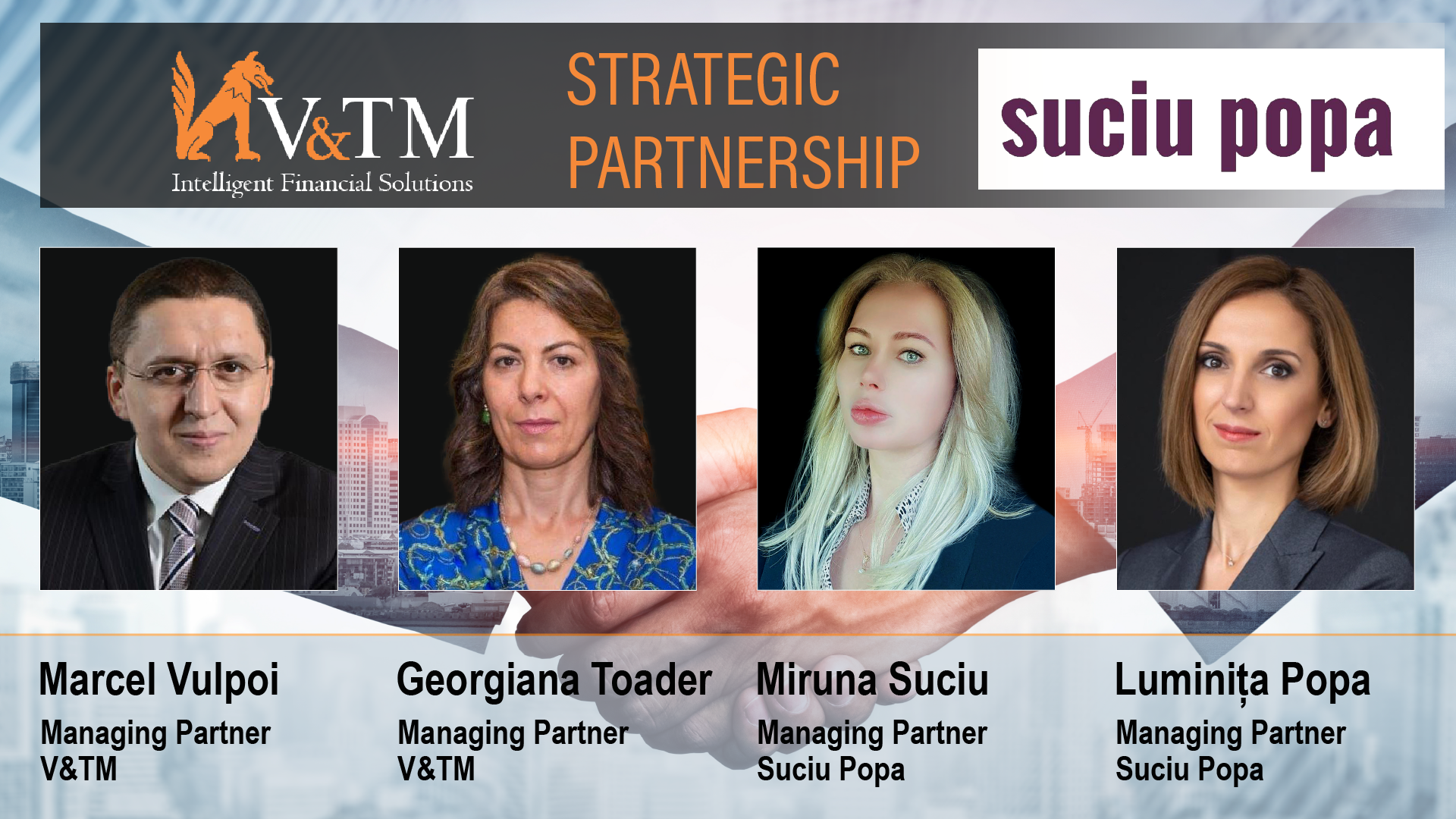 Suntem încântați să anunțăm parteneriatul dintre Vulpoi & Toader Management și Suciu Popa care dă naștere unui veritabil “one-stop-shop” de servicii juridice, consultanță contabilă, fiscală și de afaceri, prin intermediul echipelor integrate.