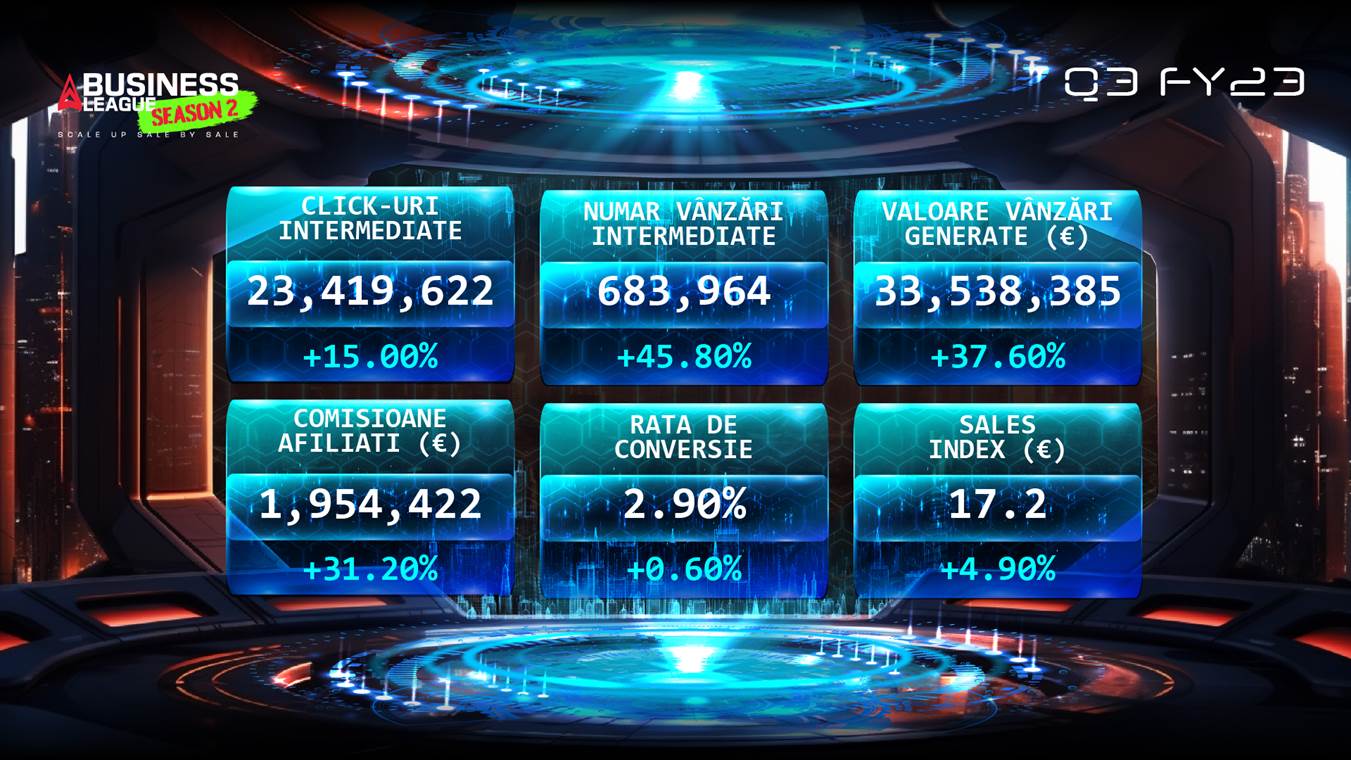 În ceea ce privește randamentul bugetelor de marketing afiliat pentru fiecare euro investit, acesta a fost de 17,2 euro, o majorare cu 5%. Valoarea medie a vânzării prin intermediul platformei a fost de 49 de euro (fără TVA), o scădere cu 6%, față de al treilea trimestru din 2022, în contextul inflației ridicate, care a influențat obiceiurile de consum ale cumpărătorilor, precum și al creșterii ponderii produselor farmaceutice din totalul vânzărilor, ale căror valoare medie este mai scăzută.