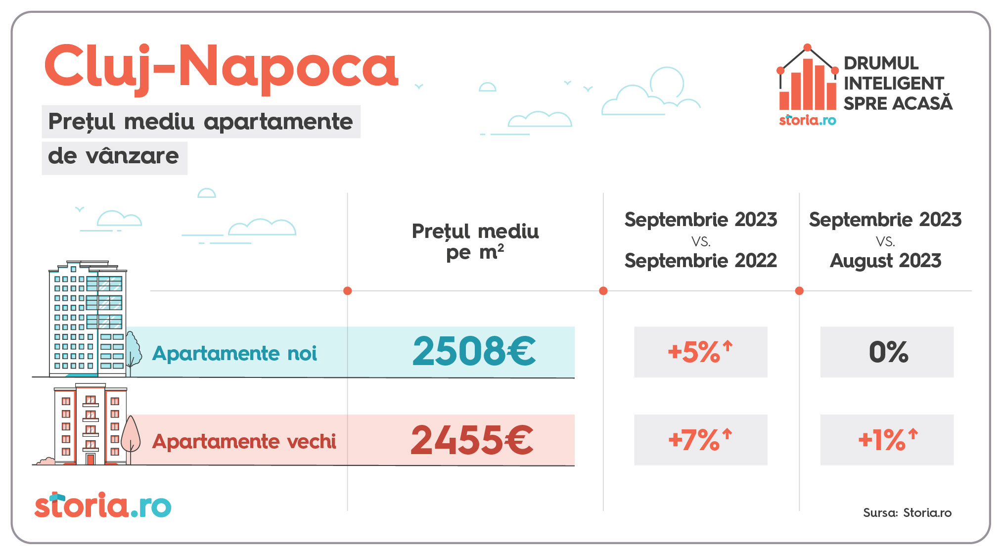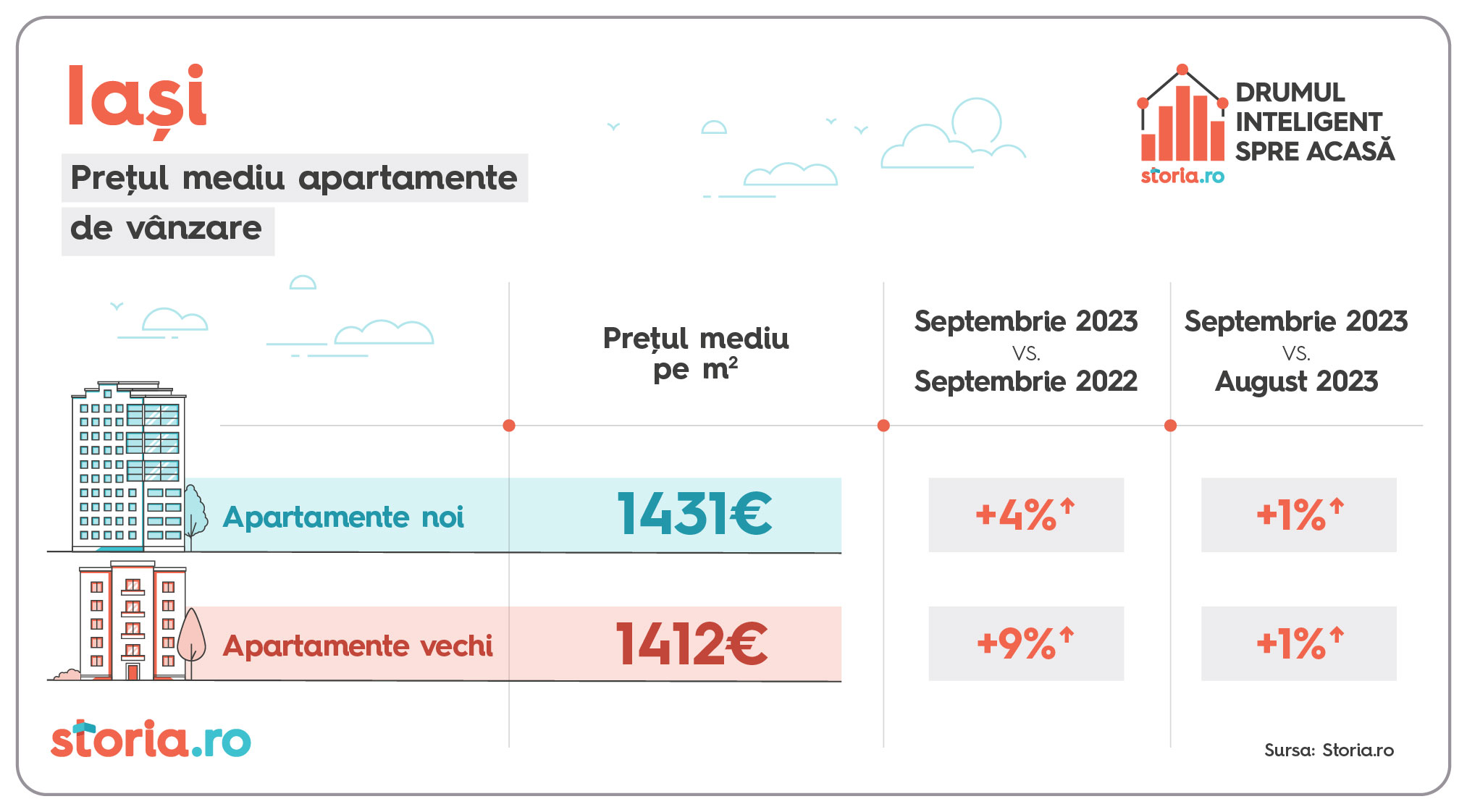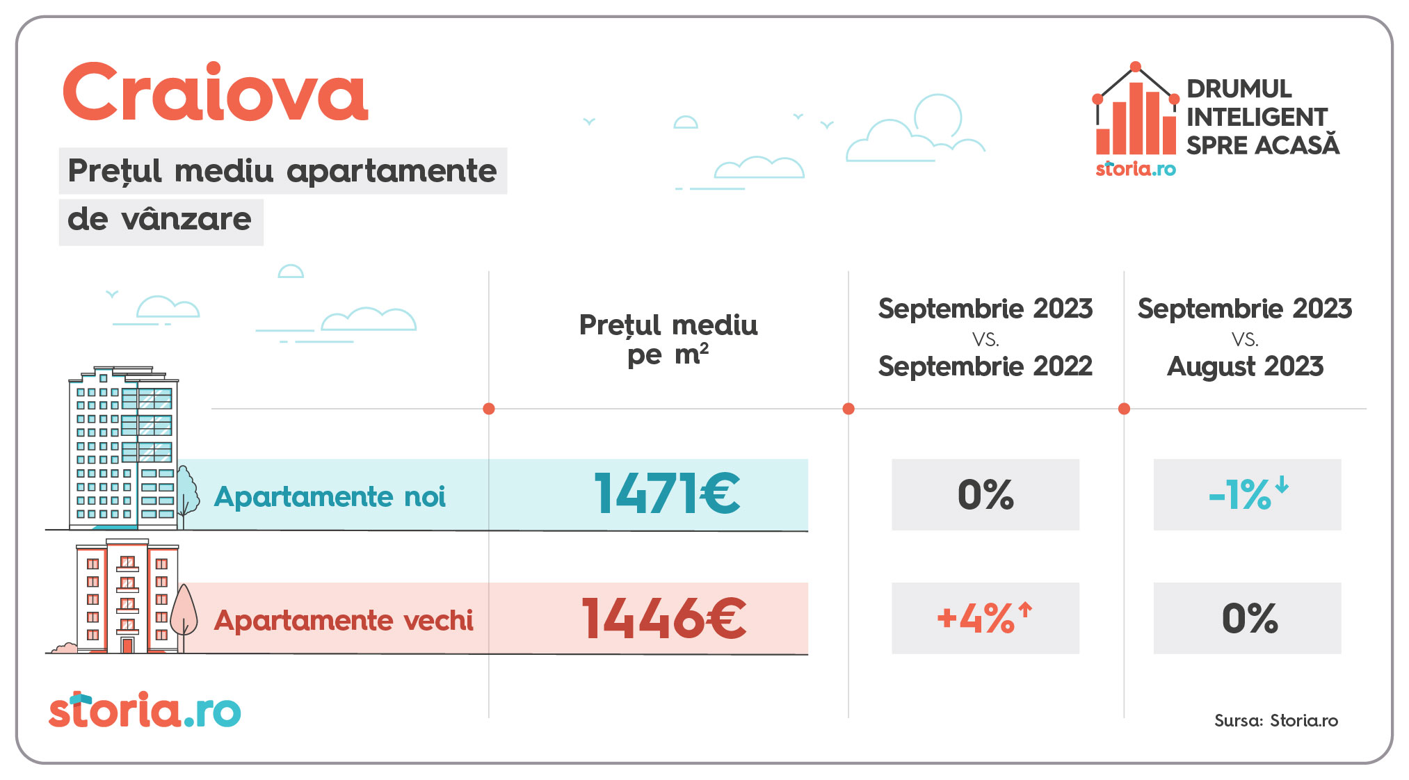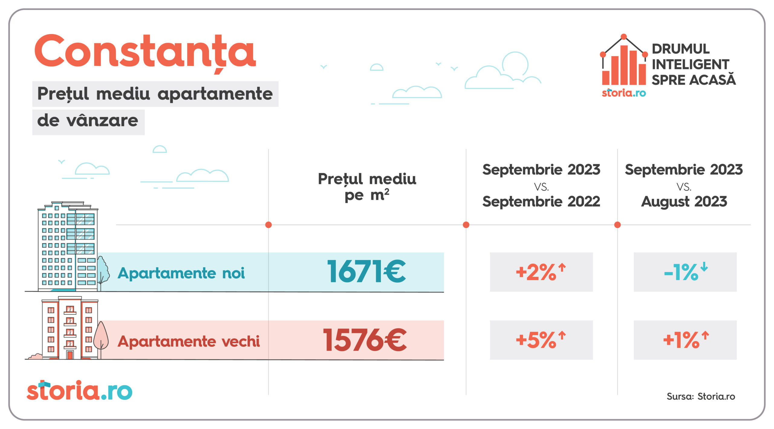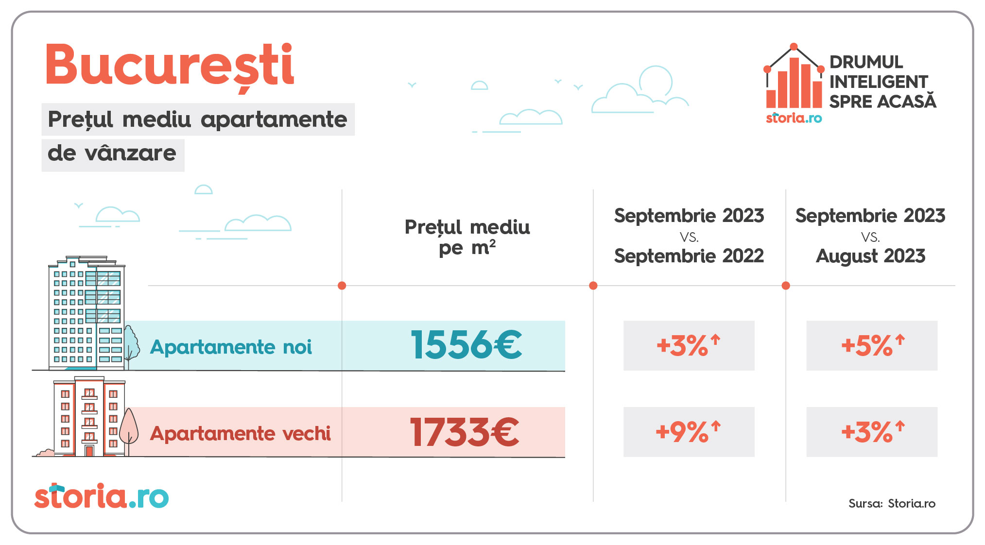 Prețul solicitat pe metru pătrat pentru apartamentele noi de vânzare a crescut cu 7% în luna septembrie a.c, față de aceeași lună a anului anterior, în timp ce prețul apartamentelor vechi a crescut, în medie, cu 6%, conform celor mai recente date de pe Storia.ro, platforma de imobiliare lansată de OLX. Față de anul trecut, în luna septembrie a.c., românii au vizualizat cu 6% mai multe pagini cu anunțuri de apartamente oferite spre vânzare și au realizat cu 14% mai multe contactări (contactările sunt interacțiunile între cei sunt în căutarea unei locuințe și cei care publică anunțuri de vânzare pe platformă). Cele mai mari creșteri de prețuri față de aceeași perioadă a anului trecut s-au înregistrat la apartamentele vechi în București și Iași (9%) și la apartamentele noi în Brașov (8%). Analiza a luat în calcul nouă dintre cele mai mari orașe de pe platforma de imobiliare Storia.ro.