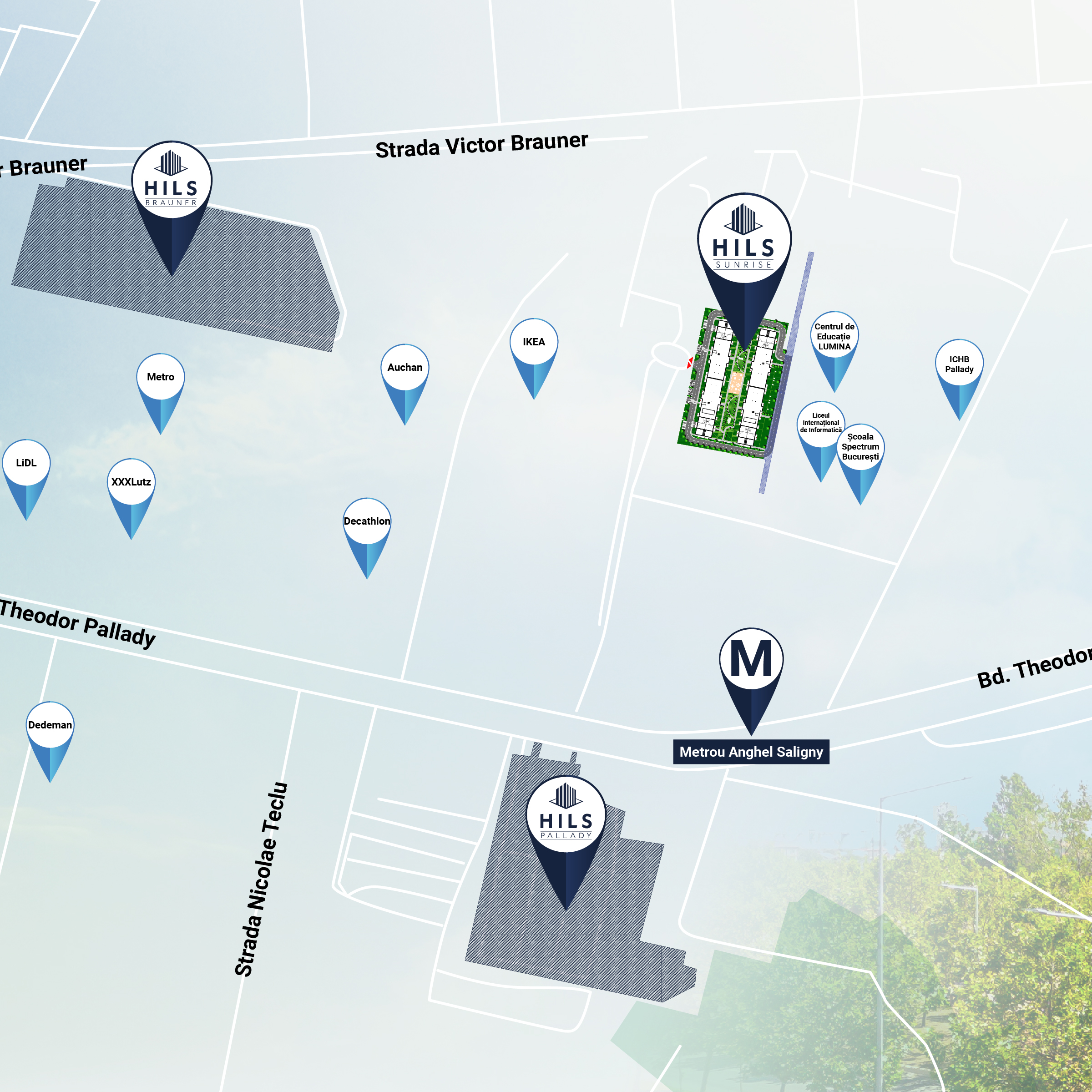 Noul proiect HILS Sunrise este poziționat vizavi de proiectul finalizat HILS Pallady și în apropierea HILS Brauner, proiect cu termen de finalizare până la începutul anului 2024. HILS Sunrise se află la 150m de stația de metrou Anghel Saligny cu acces direct la Piața Unirii și centrele universitare, prin Magistrala 3. Ansamblul are în imediata proximitate școli și centre educaționale și zona comercială Pallady ce cuprinde magazinele IKEA, Leroy Merlin, Kaufland, Metro, Auchan, Jumbo și XXXL Lutz. În plus, HILS Sunrise va beneficia de cea mai integrată rețea de facilități pentru comunitate dezvoltată până în prezent în proiectele HILS Development. Comunitatea HILS Sunrise va avea parcări subterane și supraterane, spații verzi, locuri de joacă pentru copii, spații amenajate pentru relaxare și socializare, dar și spații comerciale pentru formate de proximitate din categoriile farmacie/drogherie, băcănie, horeca și altele.