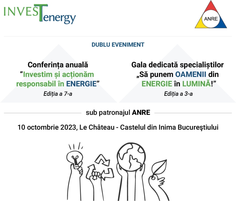 Publicația InvesTenergy continuă tradiția și organizează un dublu eveniment marți, 10 octombrie 2023, sub patronajul Autorității Naționale de Reglementare în domeniul Energiei: Conferința anuală cu tema “Investim și acționăm responsabil în ENERGIE”, ediția a 6-a, și Gala dedicată Specialiștilor „Să punem Oamenii din Energie în Lumină!”, ediția a 3-a.