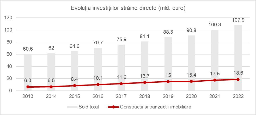 Soldul investițiilor străine directe (ISD) din sectorul construcții și tranzacții imobiliare a ajuns la finalul anului 2022 la 18,59 miliarde de euro, înregistrând a treia cea mai mare creștere în valoare absolută dintre toate sectoarele economice în 2022, după industrie (32,6 miliarde de euro în 2022 comparativ cu 29,4 miliarde de euro în 2021) și comerț (19,1 miliarde de euro în 2022 față de 17,2 miliarde de euro).