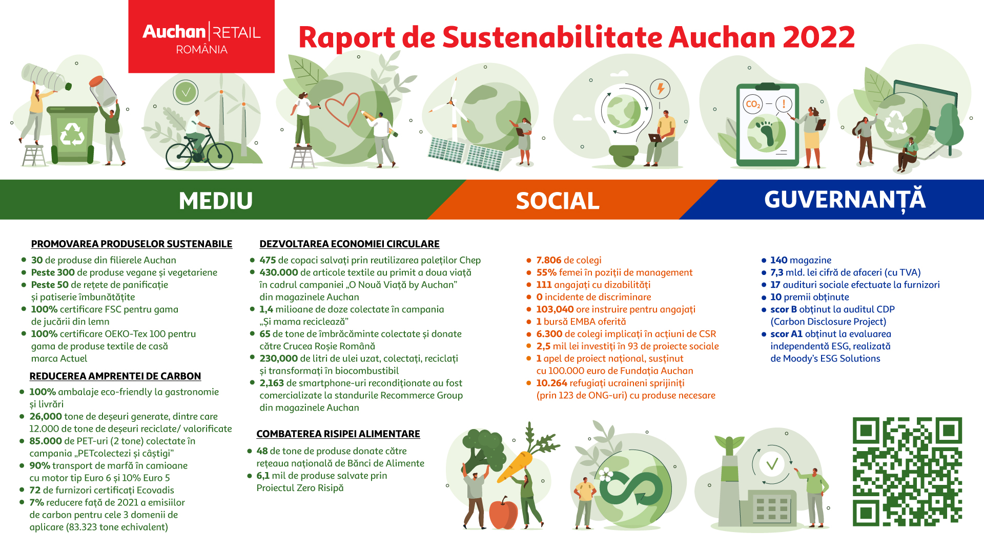 Auchan România a publicat cel de-al treilea Raport de Sustenabilitate al companiei care cuprinde date calitative și cantitative privind performanțele non-financiare, impactul activității sale în comunitate și realizările din 2022. Printre cele mai importante categorii incluse în raport se numără strategia de sustenabilitate și definitivarea Planului pentru Climat 2030, procesul accelerat de decarbonizare atât a operațiunilor din magazine, cât și a produselor. De asemenea, sunt cuprinse cele mai importante proiecte de mediu, promovarea unei alimentații sănătoase și combaterea risipei alimentare, lupta împotriva poluării cu plastic, dar și economia circulară, oamenii din companie și comunitățile sustenabile.