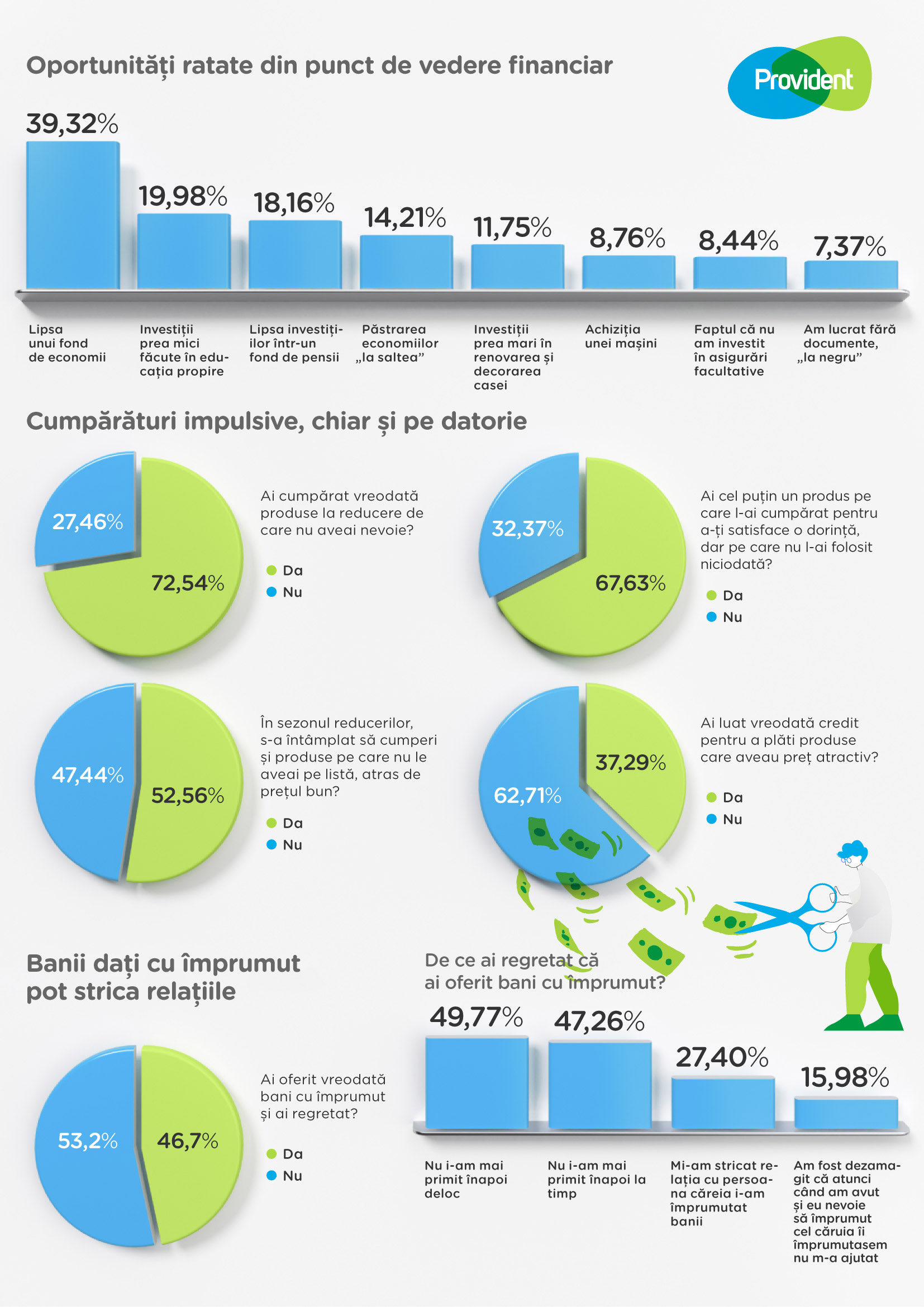 Nici ipostaza de creditor nu este întotdeauna confortabilă pentru români. Astfel, 46% dintre respondenți au recunoscut că au oferit bani cu împrumut apropiaților, o decizie pe care au regretat-o ulterior.