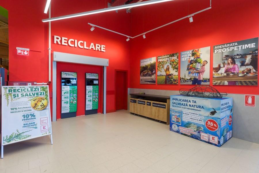 - În zona de la intrarea în magazin, clienții vor găsi un automat de reciclare dublu, de tip self-service, unde pot depune ambalaje în schimbul voucherelor de extra-reducere. Pot colecta aici trei tipuri de ambalaje: PET-uri (cu volum de până la 3 litri), sticlă și doze de aluminiu (cu volum de până la 1 litru).