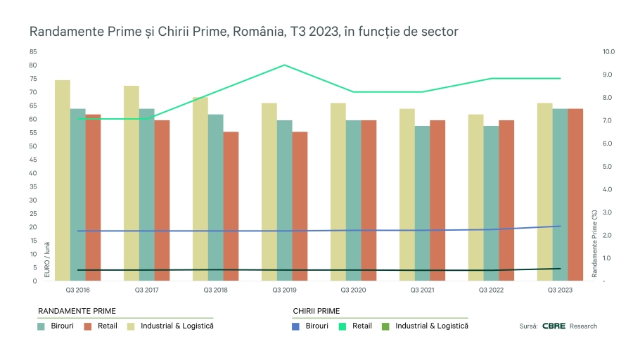 În prezent, randamentul de bază se situează la 7,5%, cu o variație anticipată a randamentului investițional de 75 de puncte de bază (bps). Cu o chirie de 20,25-euro pe metru pătrat, creșterea anuală se situează la aproximativ 6%. Volumul investițiilor pe segmentul de birouri din România a atins 15 milioane de euro în T3 2023, cu un total estimat de aproximativ 69 de milioane de euro pentru anul în curs.