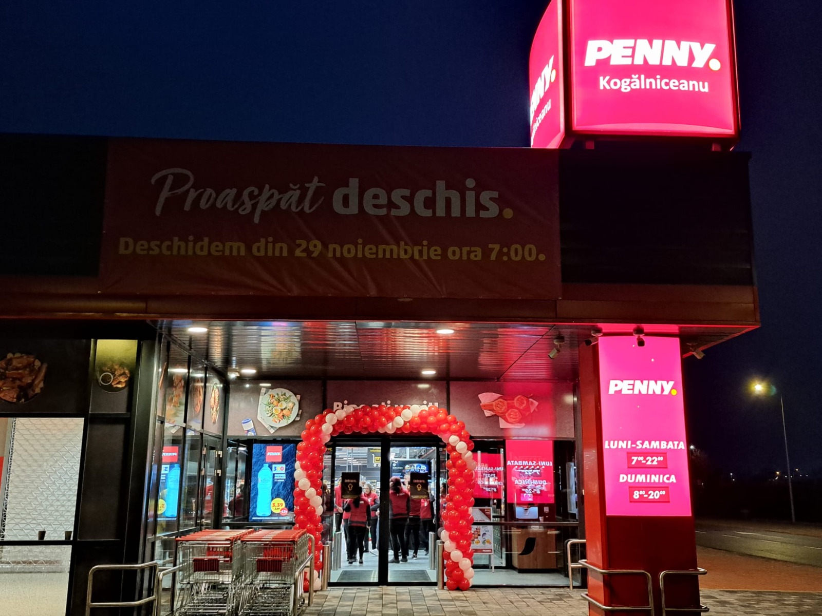- Noul PENNY din Kogălniceanu, județul Constanța, situat pe strada Tudor Vladimirescu, nr. 16 A, are o suprafață de vânzare de 856.45 mp. Magazinul este deschis din 29 noiembrie și poate fi vizitat de luni până sâmbătă între orele 7:30 – 22:00 și duminica între 8:00 – 20:00.