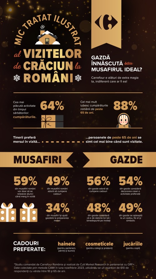 De sărbători, majoritatea românilor declară că una dintre activitățile principale este de a merge în vizită (58%), iar mai mult de jumătate dintre tineri preferă să fie musafiri, potrivit celui mai recent sondaj despre activitățile și preferințele de Crăciun în țara noastră, comandat de Carrefour România. Sărbătorile de iarnă sunt perioada preferată a anului pentru toți, mai ales pentru ocazia de a petrece mai mult timp cu familia, aceasta fiind activitatea cea mai importantă pentru 41% dintre respondenți. Dar Crăciunul vine și cu multă responsabilitate, atât pentru gazde, cât și pentru musafiri, mersul la cumpărături fiind pe primul loc dintre activitățile preferate de sărbători (64%din respondenți).