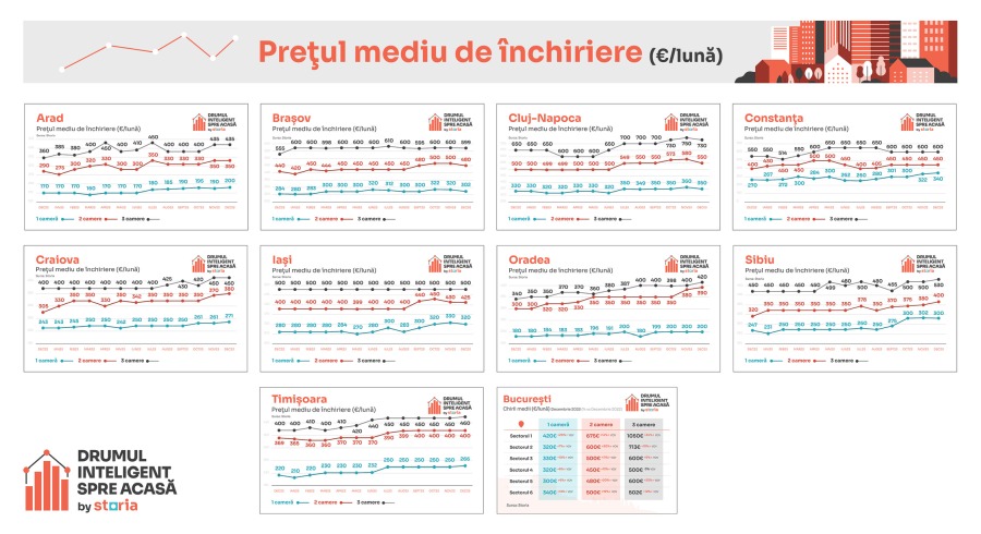 Astfel, în luna decembrie 2023 prețul mediu de închiriere al garsonierelor a scăzut la 350 de euro, în timp ce apartamentele cu două camere se închiriază, în medie, cu 550 de euro, iar apartamentele cu trei camere se închiriază cu un preț mediu de 730 de euro.