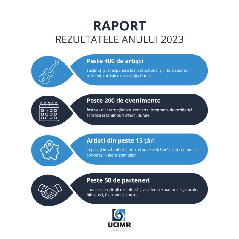 Uniunea de Creație Interpretativă a Muzicienilor din România (UCIMR) anunță raportul anului 2023, o retrospectivă a activităților și realizărilor comunității muzicale din România. Anul trecut a fost unul plin de reușite pentru membrii și echipa UCIMR, iar acest raport reflectă angajamentul continuu față de promovarea și dezvoltarea artei interpretative.