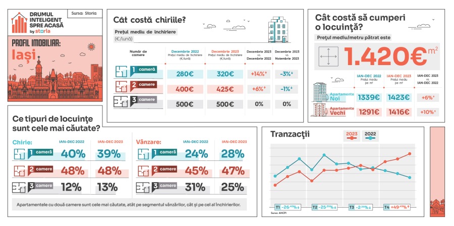 Storia, platforma de imobiliare lansată de OLX, a publicat datele celei mai recente analize „Profil imobiliar: Iași”. Conform analizei, prețul mediu de vânzare solicitat pe metru pătrat în Iași, în perioada ianuarie-decembrie 2023 a fost de 1.420 euro, iar cele mai căutate tipuri de apartamente au rămas cele cu două camere, atât pe segmentul vânzărilor, cât și pe cel al închirierilor.