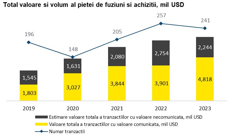 La nivel global, în 2023, activitatea de fuziuni și achiziții și-a continuat traiectoria descendentă, prelungind declinul observat în 2022 și marcând un minim al ultimilor 10 ani în ceea ce privește valoarea totală a tranzacțiilor. Această tendință a fost cauzată de factori precum creșterea costurilor de finanțare, intensificarea tensiunilor geopolitice, încetinirea generală a activității economice și accentuarea restricțiilor de reglementare. Multiplele perturbări au dus la scăderea valorii pieței globale de fuziuni și achiziții cu 13% de la an la an, în timp ce activitatea de fuziuni și achiziții din Europa a scăzut cu 19%. În acest context, activitatea de fuziuni și achiziții din România în 2023, asemenea anului 2022, a continuat să sfideze atât tendințele globale, cât și pe cele regionale, remarcându-se încă o dată prin performanțele sale.