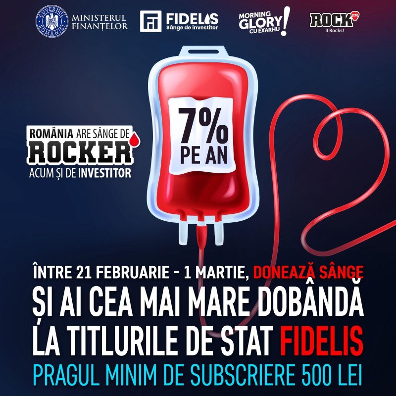 De astăzi, 21 februarie, începe prima ediție a programului de titluri de stat FIDELIS din 2024. Cu o colaborare devenită deja tradiție, programul înseamnă și continuarea campaniei „România are sânge de rocker, acum și de investitor” inițiată de Morning Glory, Rock FM, cu sprijinul Centrului de Transfuzie Sanguină București, la care MF s-a alăturat.