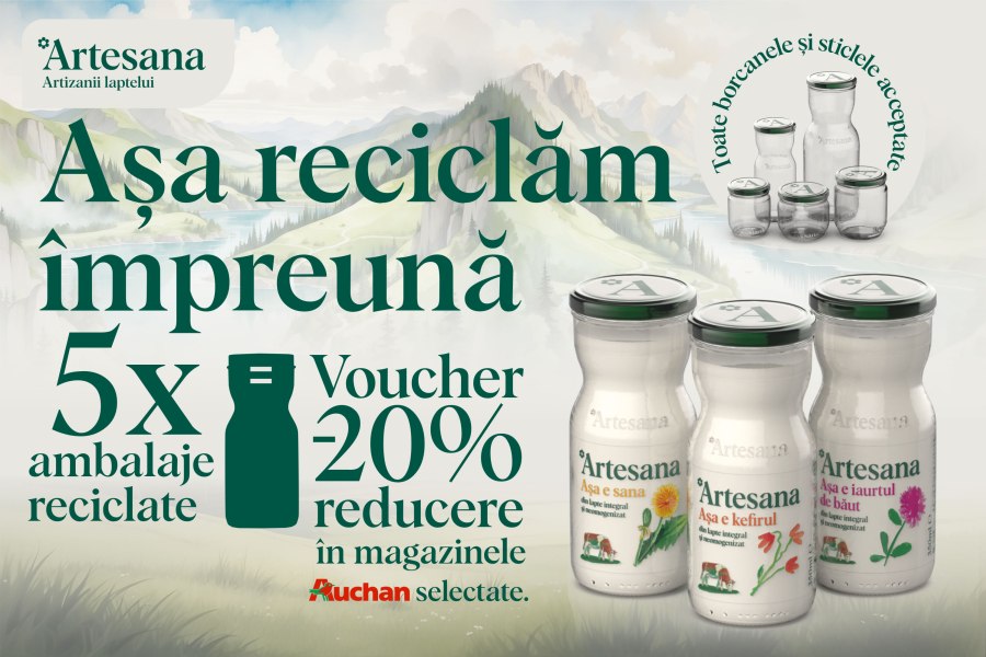 Astfel, începând cu 19 februarie și până pe 3 martie 2024, la fiecare 5 ambalaje reciclate în magazinele Auchan participante la campanie, primești un voucher cu o reducere de 20% pentru achiziția iaurtului de băut, kefirului sau sana Artesana la 350ml.