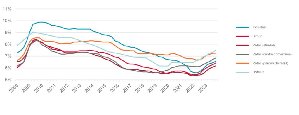 Randamentele de referință au înregistrat o creștere în cea de-a doua jumătate a anului pe toate segmentele de piață, pe fondul creșterii costurilor de finanțare, în linie cu evoluția din întreaga Europa Centrală și de Est, dar și în piețele vestice. Astfel, în piața de birouri si în cea de retail randamentele au crescut cu 50 de puncte de baza, în timp ce în segmentul industrial avansul a fost de 25 de puncte de baza. Pe fondul semnalelor că nivelul dobânzilor de referință va începe să scadă, este de așteptat ca randamentele investițiilor imobiliare să rămână la un nivel stabil în acest an.