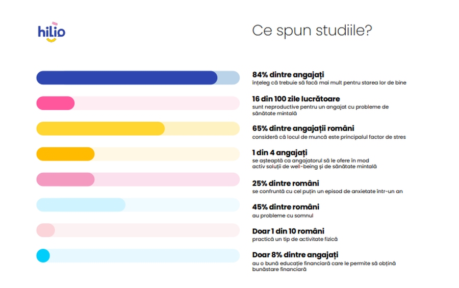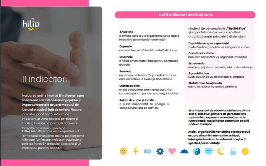 La nivel global, companiile încep să acorde o atenție sporită sănătății mintale a angajaților, iar departamentele de Resurse Umane diversifică strategiile astfel încât sănătatea și starea de bine a personalului a devenit o prioritate la locul de muncă. După 8 ani de experiență în implementarea unor programe de conștientizare a sănătății mintale, Hilio lansează WELLSCORE, o radiografie a stării de bine în organizație dezvoltată sub forma unui instrument de evaluare validat științific care ajută companiile să analizeze și să identifice cauzele fundamentale ale dezechilibrelor de performanță a angajaților.