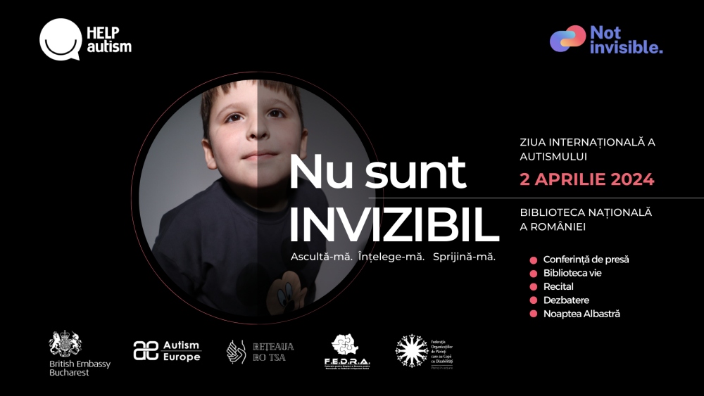 Asociația HELP Autism, împreună cu rețeaua europeană Autism Europe, vă invită cu căldură să participați la evenimentul „Not Invisible” / „Nu sunt invizibil” – dedicat celor peste 45.000 de persoane neurodivergente din România și familiilor lor, organizat cu ocazia celebrării Zilei Internaționale a Autismului în întreaga lume.