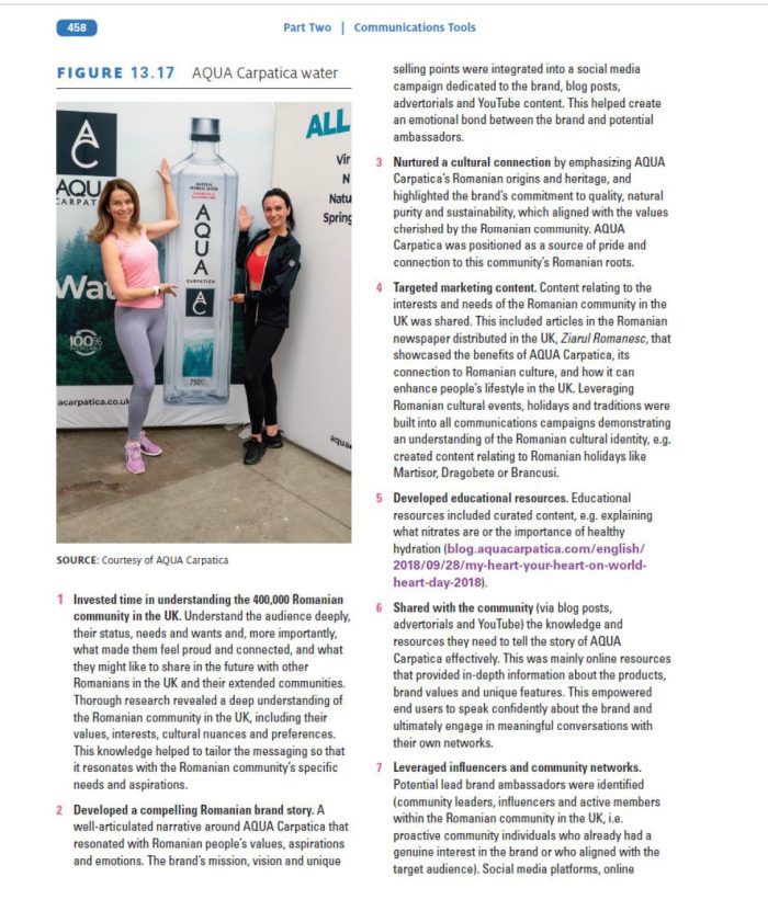 Studiul de caz AQUA Carpatica inclus în manual evidențiază 11 exemple de bune practici: cercetarea de piață (în special investiția în înțelegerea profundă comunității românești, a nevoilor, a valorilor și a convingerilor acestora); povestea de brand convingătoare care a rezonat cu valorile și aspirațiile comunității românești și comunicarea într-o campanie social media integrată; stimularea unei conexiuni culturale prin comunicarea originilor și patrimoniului românesc al brandului, poziționarea ca sursă de mândrie şi legătură a comunității românești cu rădăcinile sale; marketing prin conținut bine țintit – o campanie bazată pe conținut legat de interesele și nevoile comunității românești din Marea Britanie, tradiţia şi cultura românească și susținerea evenimentelor, sărbătorilor și tradiţiile româneşti; dezvoltarea de resurse educaționale (distribuirea de materiale educaționale şi curatorierea de conţinut specializat); resursele împărtășite în comunitate – informații accesibile online, implicarea utilizatorilor în conversații și discuții relevante; punerea în valoare a influencerilor și a rețelelor comunității românești – alegerea ambasadorilor de brand reprezentativi și construirea unei relații cu publicul; participarea la întâlnirile, evenimentele și festivalurile culturale românești; experiențele speciale care au luat în calcul şi designul experienței cu brandul, pentru a crea amintiri şi momente speciale, nu doar o prezentare de produs; conținutul generat de utilizatori care a constribuit la crearea unui sentiment de comunitate; credibilitatea, prin recenzii și testimoniale colectate de la membrii comunităţii româneşti din Marea Britanie.