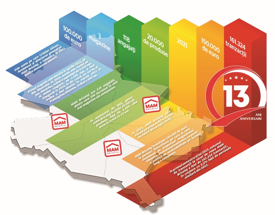 MAMBricolaj, lanțul românesc de magazine de materiale și accesorii pentru mobilă prezent pe piața AeRo a Bursei de Valori București, marchează astăzi, la aniversare a 13 ani de la deschidere un record al tranzacțiilor înregistrate de MAM Morarilor, primul magazin al rețelei dezvoltate doar în 2023: 160.600 adică mai mult de jumătate din totalul de 318.500 tranzacții înregistrate de întreaga rețea doar anul trecut. În cei 13 ani de dezvoltare constantă, MAM Bricolaj, este brandul de magazine unde fiecare bucureștean a intrat măcar o dată, pentru a vedea oferta sau a cumpăra cel puțin un produs. Bilanțul rețelei create de omul de afaceri Cristian Găvan include și expansiunea comparabilă cu vechimea sa de 13 ani a portofoliului de produse, care a crescut de 13 ori, de la 1.500 de repere inițiale la peste 20.000 în prezent, și s-a dublat față de anul trecut. MAMBricolaj a devenit și magazinul preferat al clienților finali, care au o pondere de 60% din totalul consumatorilor, restul de 40% dintre clienți fiind meseriași.