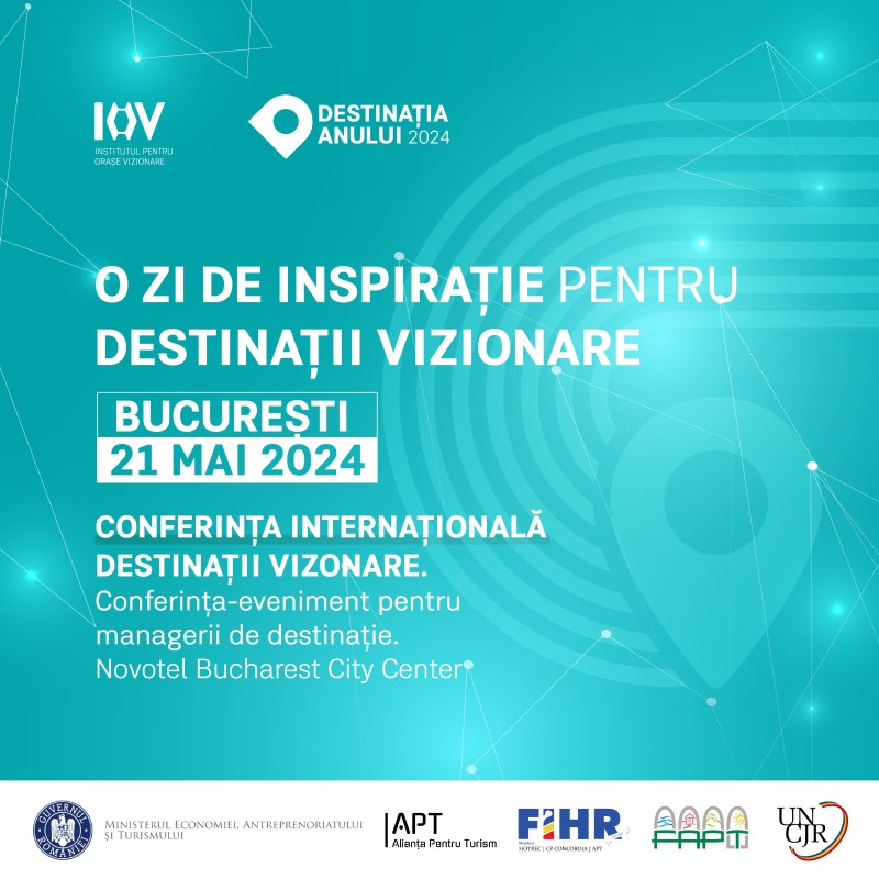 Pe 21 mai 2024 are loc la București cea de-a doua ediție a conferinței DESTINAȚII VIZIONARE, singurul eveniment de management și marketing de destinație din România. Anul acesta, în premieră, conferința este urmată de Gala DESTINAȚIA ANULUI, la Ateneul Român, o seară de celebrare a brandurilor turistice deja consacrate, câștigătoare ale competiției Destinația Anului. Cele două evenimente sunt organizate de Institutul pentru Orase Vizionare, asociație de educație și consultanță în place branding si placemaking, și Destinatia Anului, cea mai importantă competiție de promovare a turismului intern, cu scopul de a ajuta la construcția și afirmarea de branduri turistice puternice în România și la dezvoltarea competențelor profesionale în domeniu.