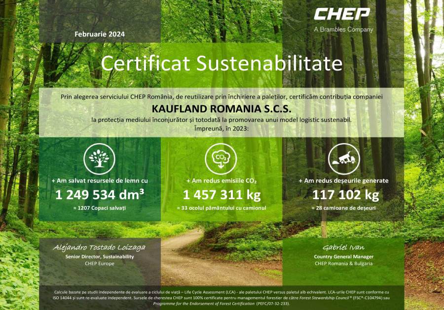 Performanțele obținute de Kaufland, la nivel operațional, în 2023 în direcția sustenabilității sunt recunoscute pentru al patrulea an consecutiv. Compania a primit certificatul de sustenabilitate din partea CHEP România.