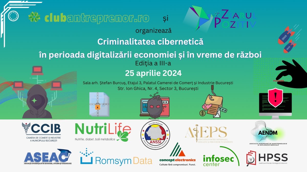 Club Antreprenor și Ziarul Pozitiv organizează joi, 25 aprilie 2024, cea de-a treia ediție a conferinței cu tema „Criminalitatea cibernetică în perioada digitalizării economiei și în vreme de război”. Evenimentul va avea loc în Sala arh. Ștefan Burcuș, situată la Etajul 3 al Palatului Camerei de Comerț și Industrie București, de pe Str. Ion Ghica, Nr. 4, Sector 3, București.