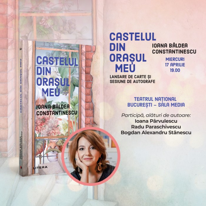 Editura Litera vă invită miercuri, 17 aprilie, ora 19.00, la lansarea romanului Castelul din orașul meu de Ioana Bâldea Constantinescu ce va avea loc în Sala Media a Teatrului Național București (TNB – Bulevardul Nicolae Bălcescu nr. 2). Participă, alături de autoare, scriitorii Ioana Pârvulescu, Radu Paraschivescu și Bogdan Alexandru Stănescu. Evenimentul va fi urmat de o sesiune de autografe.