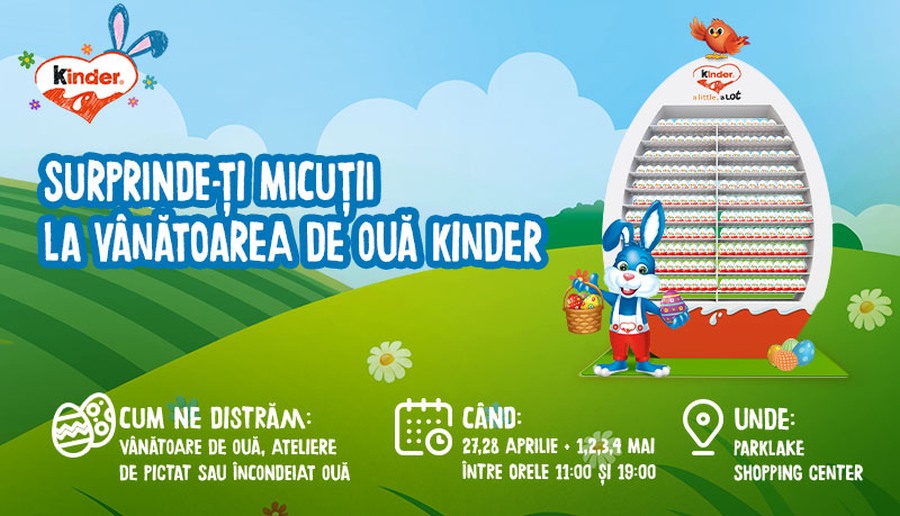 Perioada Paștelui vine cu multe activități vesele și colorate pentru copiii cu chef de joacă. În perioada 27-28 Aprilie și 1-4 Mai, între orele 11:00 – 19:00, Kinder a pregătit o diversitate de surprize pentru cei mici, printre care și un ou uriaș situat în Main Square. Cei mari și mici deopotrivă vor putea participa la atelierele de pictat și decorat ouă din lemn din interiorul centrului comercial. În zona de exterior, copiii își pot testa îndemânarea într-o vânătoare de ouă.