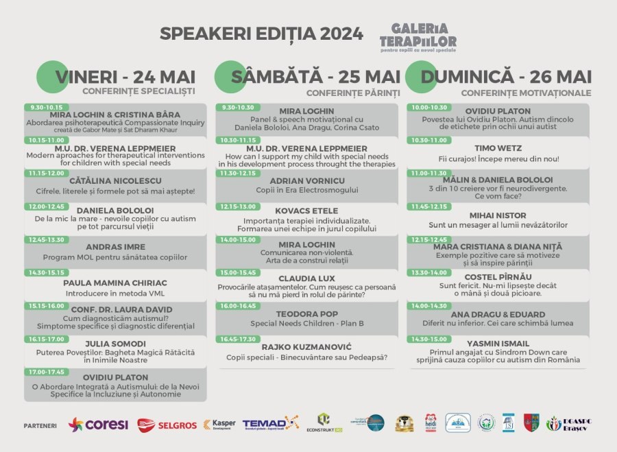 Acest eveniment va avea loc în perioada 24-26 mai 2024, la sala IAR 80 Coresi Business Park și în Piața cu copaci, Coresi Shopping Center unde familiile, specialiștii, terapeuții și speakerii motivaționali se vor reuni pentru informare, educație, inspirație și conectare pentru un viitor mai bun și mai incluziv al copiilor cu nevoi speciale.