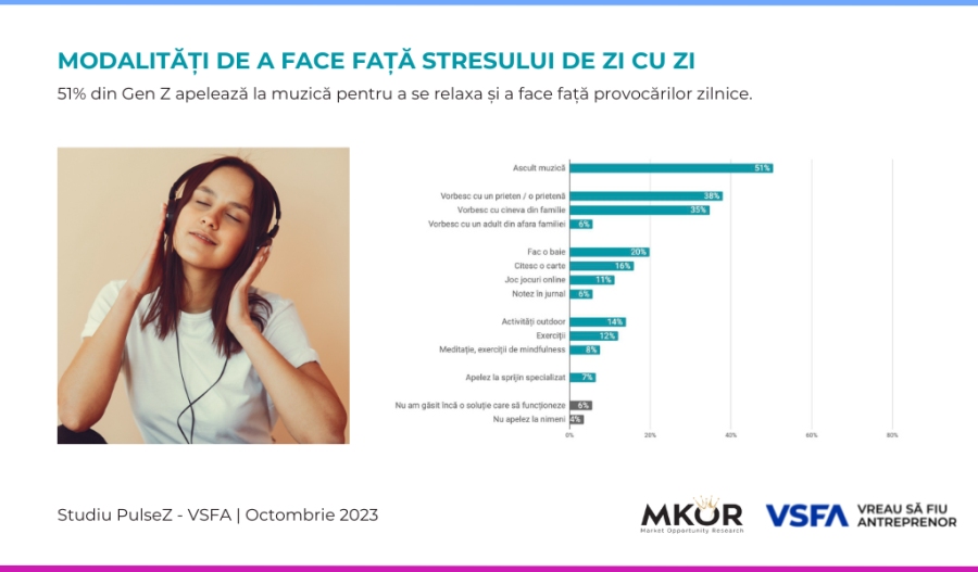 În ceea ce privește gestionarea stresului din viața de zi cu zi, Generația Z apelează în general la 3 metode. Conform studiului, atunci când se simt copleșiți de stres și presiunea provocărilor cotidiene, majoritatea tinerilor (51%) ascultă muzică pentru a se relaxa. De asemenea, o parte semnificativă (38%) preferă să discute cu un prieten sau o prietenă, iar alții (35%) aleg să discute cu un membru al familiei.