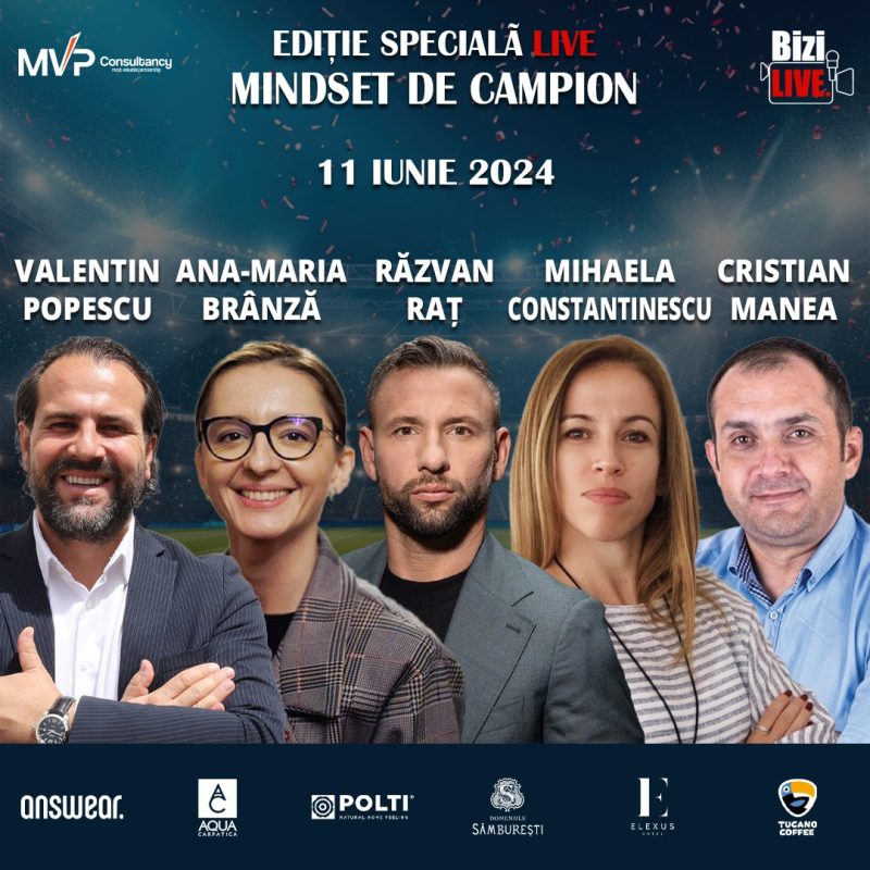 11 iunie 2024, în Bucureșți, la Palatul Universul va avea loc ,,Mindset de Campion’’, primul eveniment românesc de tip emisiune cu public care abordează rolul semnificativ pe care îl joacă atitudinea mentală, provenită din sport, în determinarea obținerii rezultatelor pozitive în toate aspectele vieții: personal, interpersonal, familial și afaceri. Invitații vor fi campioni mondiali, europeni, naționali, sportivi de performanță și anduranță, performeri și experți din sănătate, educație și business. Evenimentul este inițiat și organizat de BiziLive.tv și MVP Consultancy.