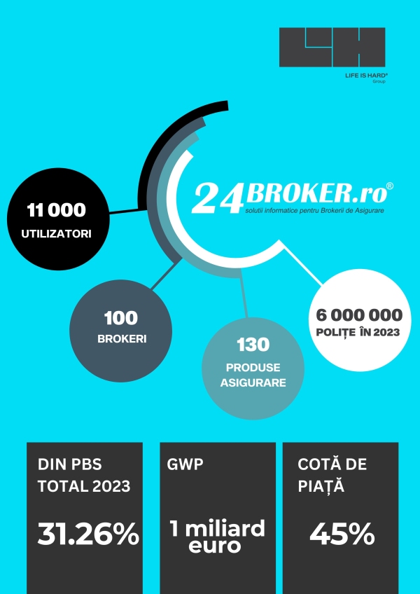 Utilizată de aproape 100 de brokeri și integrată cu toți asigurătorii majori, platforma susține peste 11.000 de utilizatori și oferă acces la mai mult de 130 de produse de asigurare. Cu o cotă de piață de aproximativ 45% și PBS de peste 1 miliard de euro, 24Broker.ro continuă să fie lider în industria de asigurări. În 2023, 24Broker.ro a intermediat 31.26% din PBS total, valoarea primelor distribuite de companiile de brokeraj situandu-se la circa 14,7 miliarde lei.
