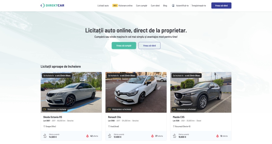 Direktcar.ro, prima platformă de licitații auto de pe piața locală, prin care românii pot vinde sau pot cumpăra mașini, de oriunde s-ar afla și de până la 5 ori mai repede decât prin alte metode, se lansează oficial. Platforma aduce o inovare remarcabilă în domeniul auto: tehnologia unică de vizionare online în timp real a autoturismelor. Aceasta tehnologie revoluționează modul în care românii pot achiziționa vehicule, permițând prezentarea și achiziția mașinilor din orice localitate din țară sau din străinătate.