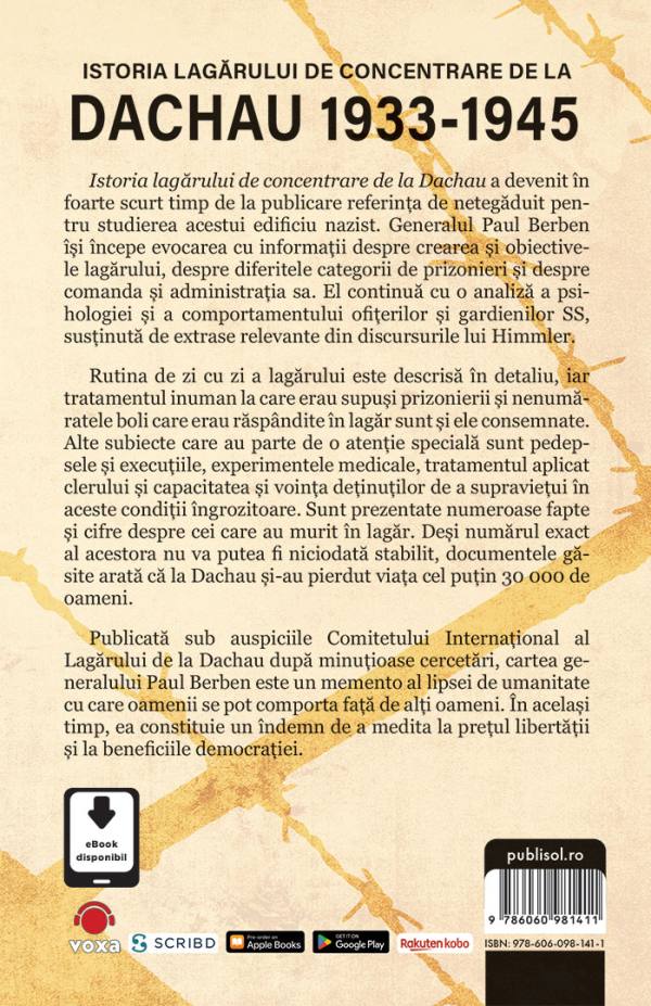 Cartea „Istoria lagărului de concentrare de la DACHAU 1933-1945”, de Paul Berben este disponibilă acum pentru precomandă pe site-ul editurii Publisol. Toți cei interesați pot rezerva un exemplar, beneficiind astfel de șansa de a fi printre primii care vor avea acces la această lucrare esențială odată ce va fi lansată oficial la jumătatea lunii august.