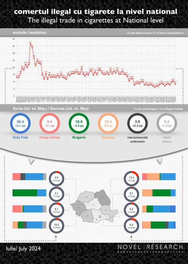 „În luna iulie, contrabanda scade în majoritatea regiunilor țării, reflectând o tendință sezonieră obișnuită în această perioadă a anului. Cea mai mare scădere se înregistrează în nord-est, de 9,1 p.p., deși zona continuă să fie cea mai afectată de comerțul ilegal, cu un procent de 17,4%. O scădere semnificativă se înregistrează și în sud, cu 4,9 p.p. până la 6,4%. Din punct de vedere al provenienței produselor de pe piața neagră, cea mai mare pondere o deține în continuare Duty Free (39,4%), aflându-se în creștere cu 3,1 p.p., urmată de Moldova (22,4%) și de Bulgaria, care scade sub 20%, cu 3,3 p.p. până la 18,9%”, a declarat Marian Marcu, Director General Novel Research.
