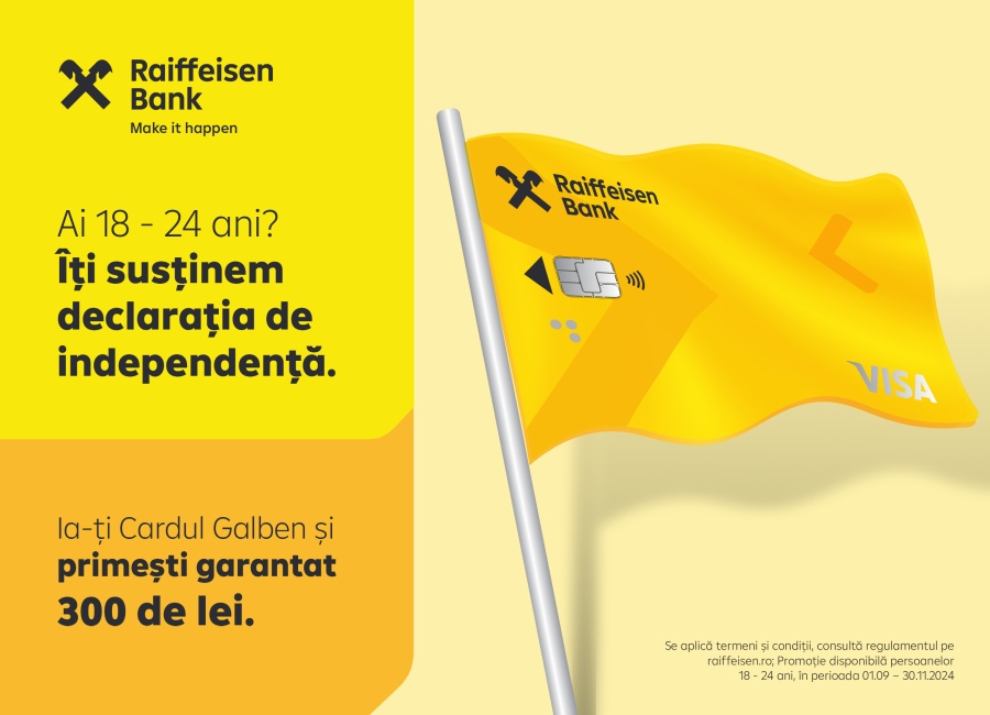 Prin cea mai recentă campanie, lansată la începutul lunii septembrie, Raiffeisen Bank România se adresează tinerilor între 18 și 24 de ani, unul dintre cele mai dinamice segmente de clienți bancari, cu invitația de a-și declara independența financiară prin achiziția Cardului Galben, care te încurajează “să faci doar ce alegeri vrei tu”.