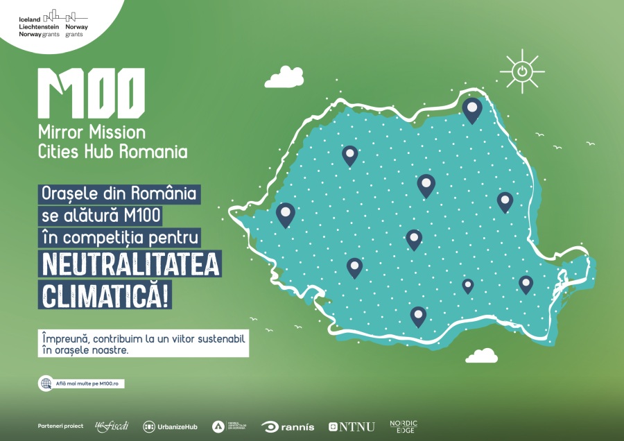 Inițiativa „Towards Climate-Neutral and Smart Cities through Mutual Learning, Engagement and Capacity-Building” are ca obiectiv general sprijinirea orașelor, în special a celor din regiunile mai puțin dezvoltate și a orașelor mici și mijlocii, în planificarea tranziției către neutralitatea climatică. Proiectul este finanțat din granturi SEE și Norvegiene prin Fondul pentru Relații Bilaterale și implementat sub egida HUB-ului M100, prin UEFISCDI în calitate de operator de programe în parteneriat cu Urbanize Hub – Asociația Institutul pentru Dezvoltare Locală, Ordinul Arhitecților din România (OAR), Norwegian University of Science and Technology (NTNU), Nordic Edge și RANNIS – Icelandic Center of Research.