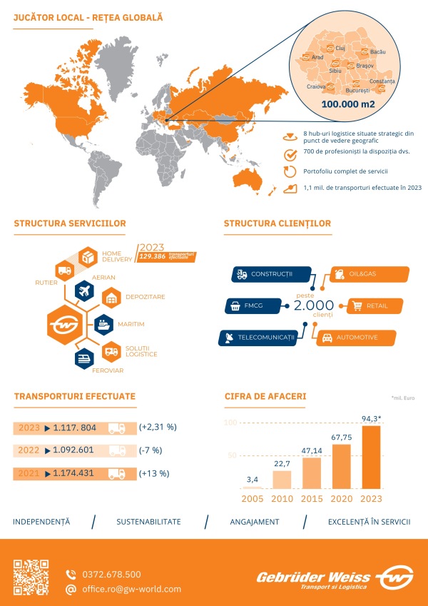 Gebrüder Weiss aniversează 30 de ani de activitate în România și se bazează astăzi pe o infrastructură națională de hub-uri logistice situate în București, Arad, Sibiu, Cluj, Bacău, Brașov, Constanța și Craiova. Filiala din Sibiu a fost extinsă în 2022, iar în 2023 a început construcția celui de-al doilea hub logistic de lângă București. Compania oferă clienților săi soluții de logistică inteligente și oferă servicii flexibile de distribuție prin transport rutier, feroviar, aerian și maritim.