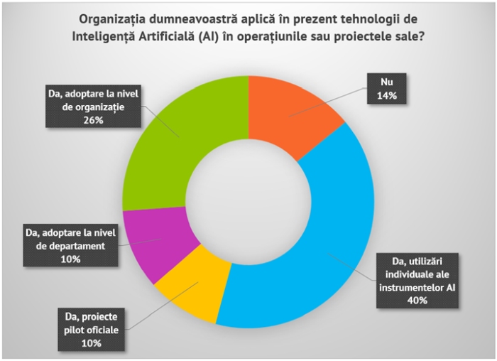 – 46% dintre companiile din România au adoptat deja oficial, în diverse forme, AI, la nivel de organizație, departamental sau prin proiecte-pilot.