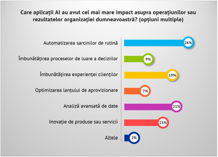 – Aproape două treimi (64%) dintre organizații sunt interesate de inteligența artificială pentru automatizarea sarcinilor de rutină, 53% recunosc potențialul AI în dezvoltarea de noi produse sau servicii, iar 51% – pentru îmbunătățirea experiențelor clienților.