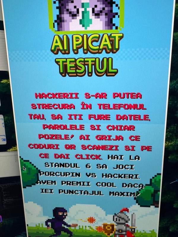 Pentru a atrage atenția asupra pericolelor din mediul online și a invita tinerii la stand, au fost amplasate două totemuri-capcană în spațiul evenimentului, concepute să simuleze o fraudă cibernetică. Acestea afișau un cod QR, promițând câștiguri rapide. În cele două zile ale evenimentului, codul a fost scanat de peste 3.000 de ori, iar cei care l-au accesat au primit imediat o avertizare: hackerii ar putea folosi astfel de metode pentru a fura datele, parolele și chiar fotografiile din telefon. Recomandarea este să acordați atenție la ce coduri QR scanați și la ce linkuri dați click! Tinerii prezenți la standul #SigurantaOnline au participat la un concurs interactiv cu premii, unde au învățat cum să se protejeze pe internet (https://porcupin.sigurantaonline.ro/game). Cei care și-au demonstrat abilitatea de a naviga în siguranță în mediul online au primit premii.