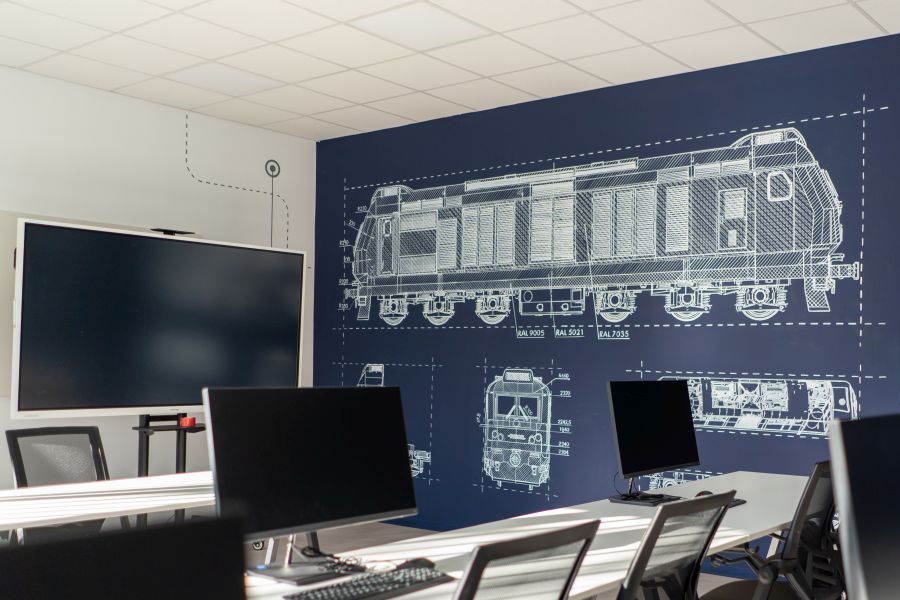 De la tehnologie de ultimă generație, până la pereții care povestesc, prin desene, istoria și inovația din transportul feroviar – totul a fost gândit pentru a inspira. Fragmente din inima industriei – schițe ale locomotivei Dema 3000 (locomotivă Diesel Electrică, pe 6 osii), modernizată la RELOC Craiova și componente unice produse la REVA Simeria.