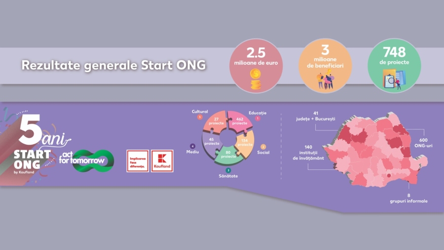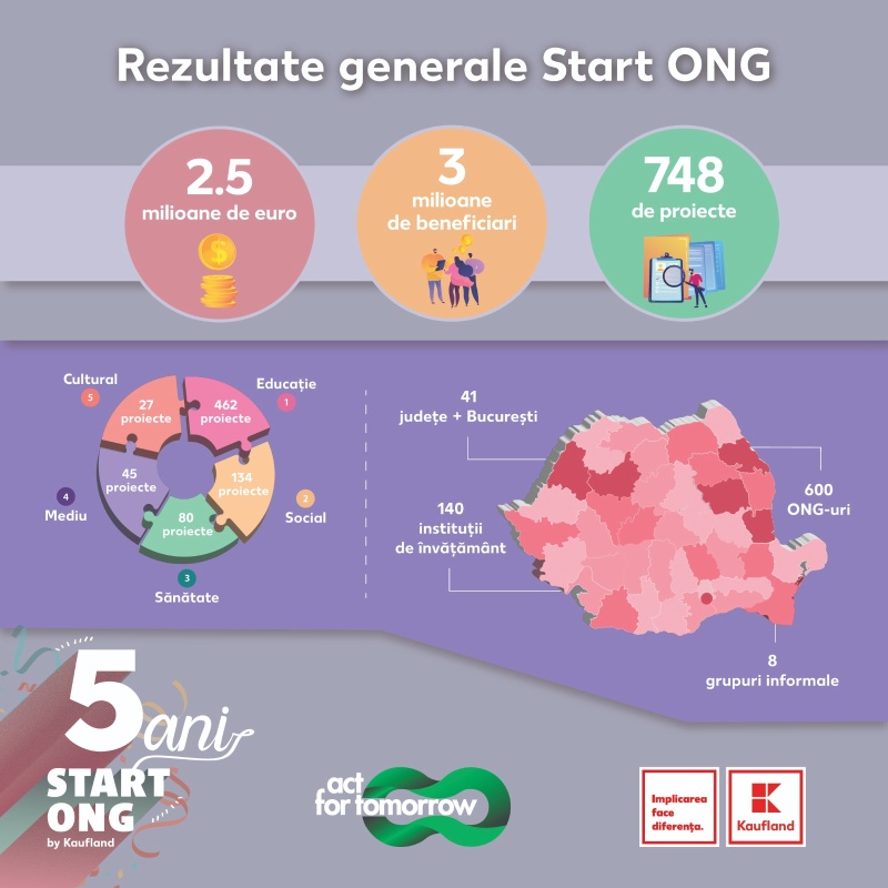 748 de proiecte, în valoare totală de 2.5 milioane de euro, au schimbat în bine viețile 3 milioane de persoane în ultimii 5 ani. Aceasta este principala realizare a programului Start ONG, lansat de Kaufland România și implementat de Asociația Act for Tomorrow, cel mai simplificat mecanism de finanțare dedicat ONG-urilor, instituțiilor de învățământ preuniversitar și grupurilor informale.