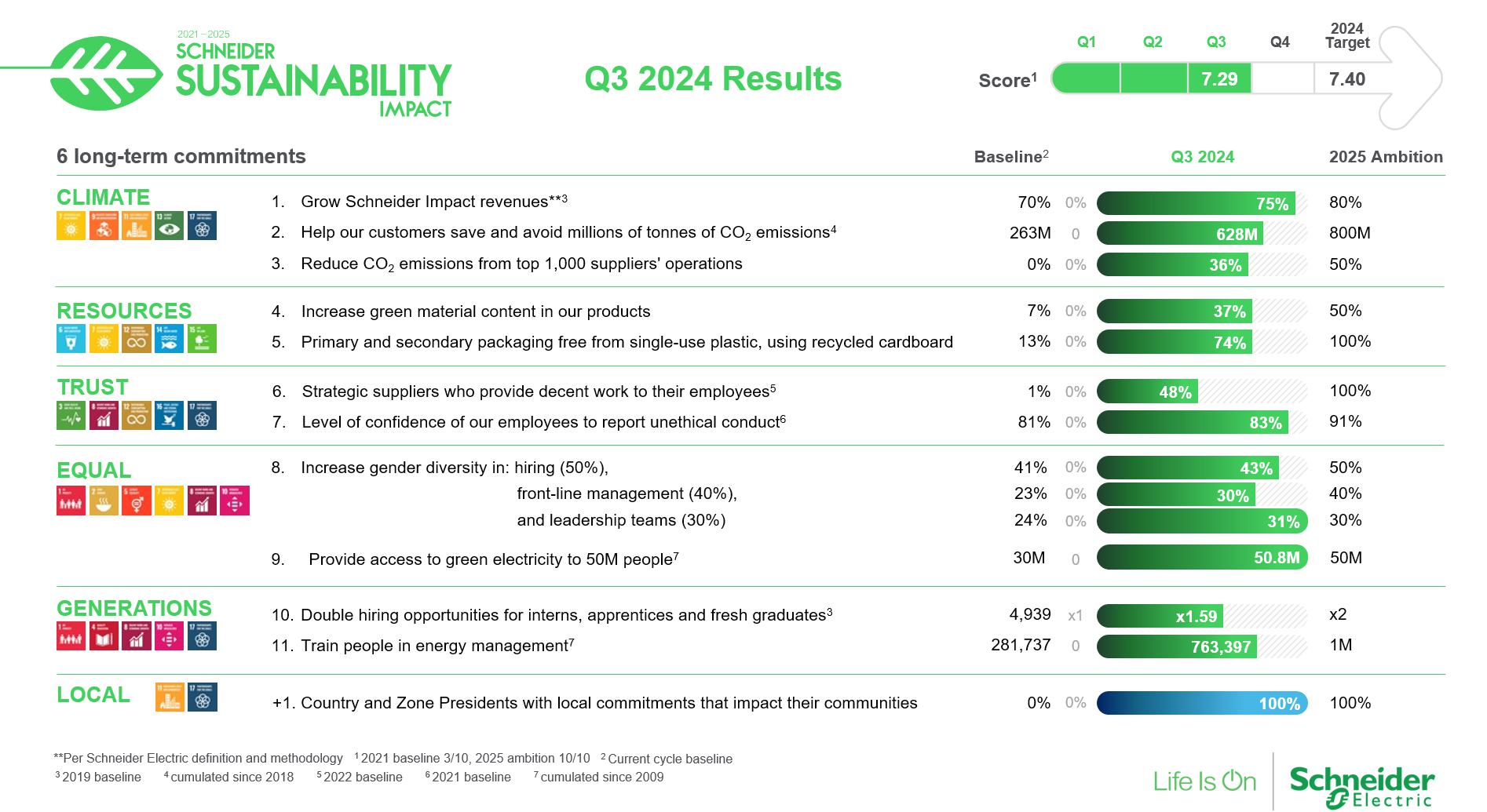 La sfârșitul trimestrului, scorul general al Schneider Electric în materie de Sustainability Impact (SSI) a fost de 7,29 din zece, compania poziționându-se bine pentru a atinge ținta de 7,40 până la sfârșitul anului, cu două etape majore atinse: