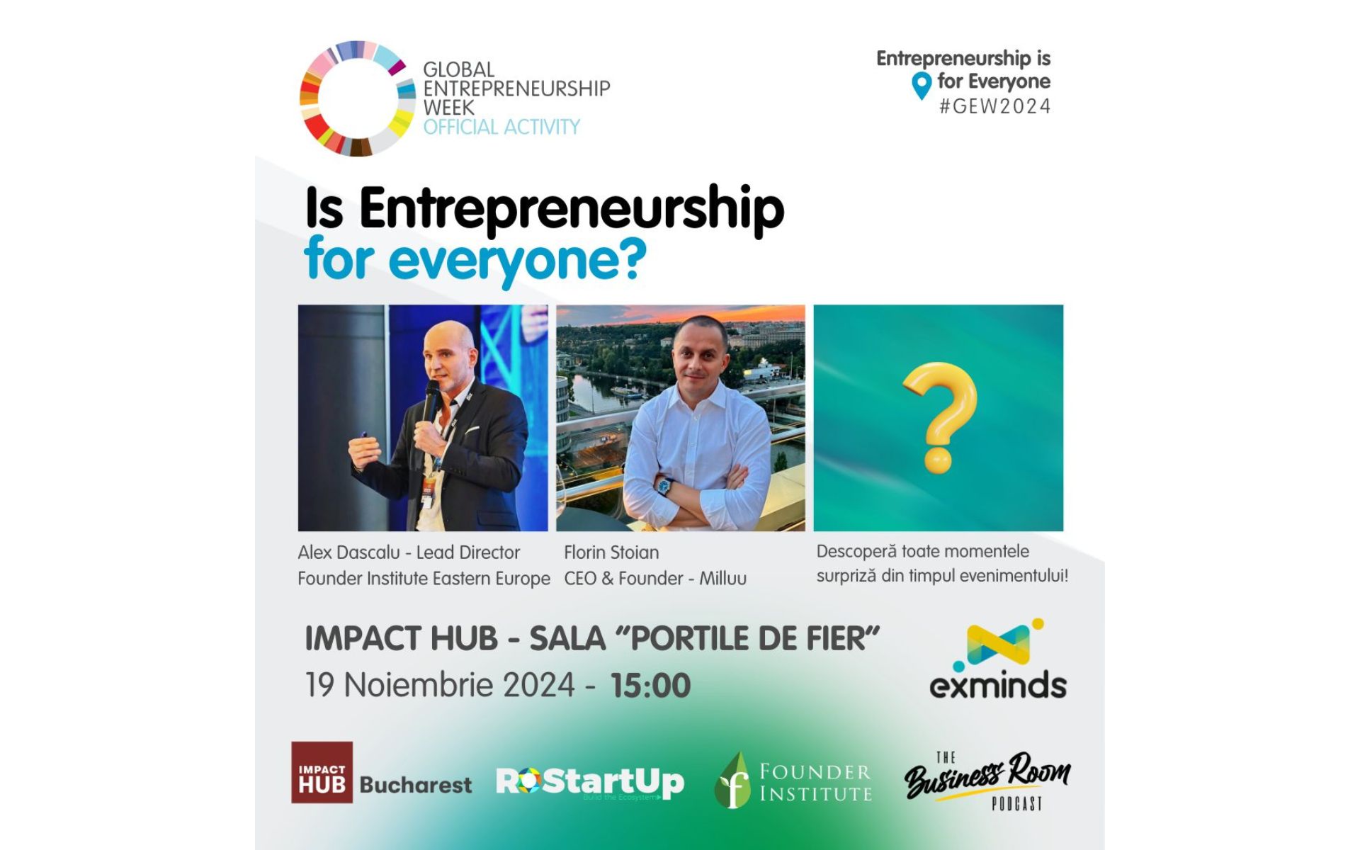 Exminds, în parteneriat cu Impact Hub Bucharest, Founder Institute, RoStartup și Business Room Podcast, organizează astăzi, 19 noiembrie 2024, de la ora 15:00, un eveniment dedicat antreprenorilor și celor pasionați de strategie, inovație și învățare activă, parte din Global Entrepreneurship Week (GEW).