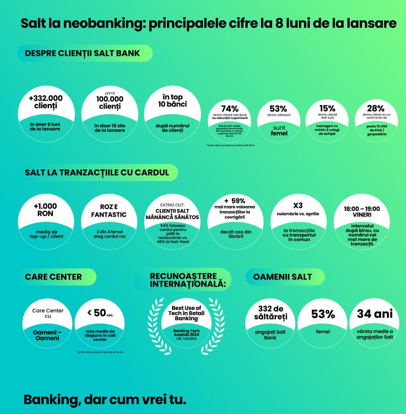 „Finalul de an aduce un bilanț – reper pentru următoarea noastră etapă de dezvoltare. Încă din primele 10 zile am reușit să atragem peste 100 de mii de clienți, iar în prezent suntem peste targetul asumat la lansare, clienți bine profilați și poziționați socio-demografic, iar aceste realizări confirmă apetitul pieței pentru servicii bancare digitale, adaptate nevoilor de azi. Am creat prima bancă românească 100% digitală, recent recunoscută internațional prin distincția „Best Use of Tech in Retail Banking” obținută în cadrul Banking Tech Awards 2024 la Londra. Toate acestea confirmă potențialul inovațiilor noastre în sectorul bancar digital, validând promisiunea noastră de la lansare și traiectoria noastră în continuare: Banking, dar cum vrei tu. Mulțumim tuturor clienților noștri pentru încredere”, declară Gabriela Nistor, CEO, Salt Bank.