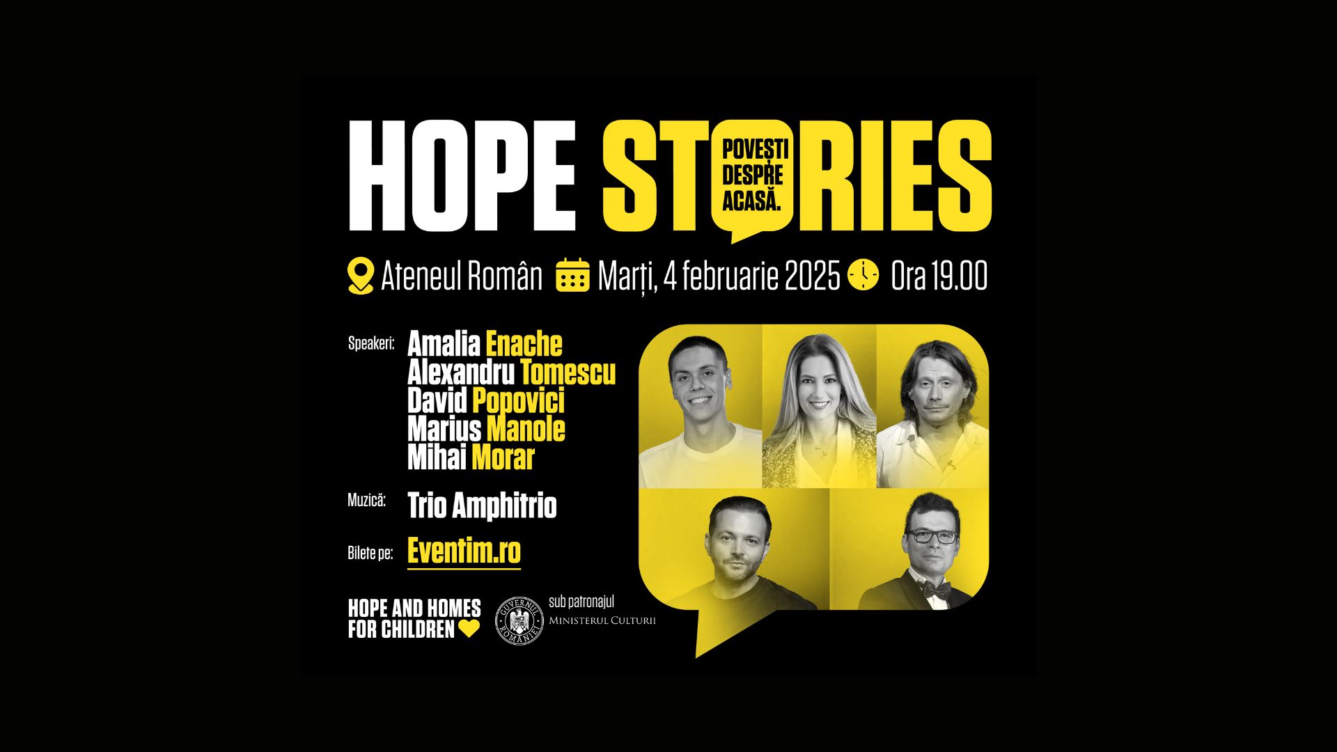 Marți, 4 februarie 2025, ora 19:00, va avea loc, la Ateneul Român, Gala HOPE STORIES – Povești despre Acasă. David Popovici, Amalia Enache, Alexandru Tomescu, Marius Manole și Mihai Morar urcă pentru prima dată împreună pe scena Ateneului, pentru a împărtăși propriile istorii, niciodată rostite, despre ceea ce înseamnă pentru ei „ACASĂ”. Hope and Homes for Children vă așteaptă la o seară în care emoțiile, poveștile inspiraționale și muzica se vor uni pentru a celebra copilăria, prin poveștile incredibile ale celor cinci Ambasadori ai Fundației. Evenimentul se desfășoară sub patronajul Ministerului Culturii și marchează finalul campaniei de strângere de fonduri „Ambasador pentru ACASĂ. Când construim o CASĂ, construim un OM”. Biletele sunt disponibile pe Eventim.ro.